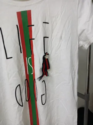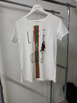 Camiseta blanca con estampado Life is Good y detalles de rayas verdes y rojas. - Diseño frontal con texto y aplique. - Manga corta.