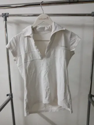 Blusa deportiva de manga corta en color blanco. Diseño con cuello tipo polo y detalles de costuras. - Cuello tipo polo. - Manga corta. - Diseño con líneas de costura.