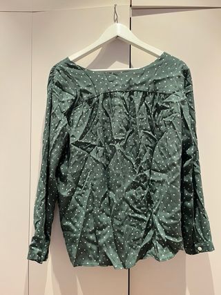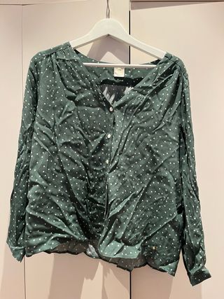 Blusa de manga larga con un estampado de lunares blancos sobre fondo verde. - Cuello en V. - Cierre de botones. - Detalle de fruncido en los hombros. 100% viscosa