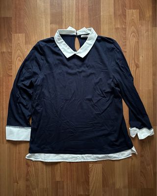 Elegante blusa de oficina con un diseño bicolor y detalles en el cuello. - Cuello blanco con adornos. - Mangas largas con puños blancos. - Diseño asimétrico en el bajo.