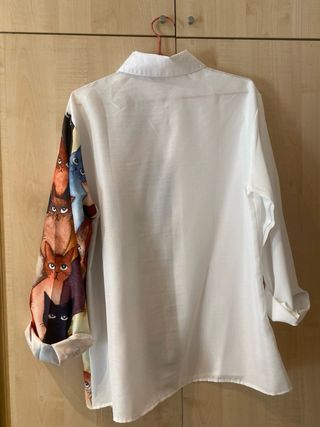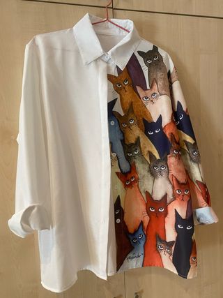 Blusa de manga larga con un diseño llamativo y original. - Mitad blanca lisa, mitad con estampado de gatos multicolores. - Cuello camisero. - Puños enrollados.