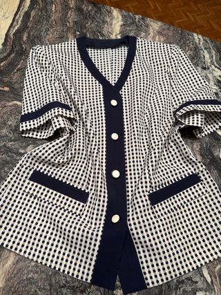 Blusa vintage con un bonito estampado de cuadros. - Diseño con cuello en V. - Cierre de botones. - Mangas cortas con detalle.