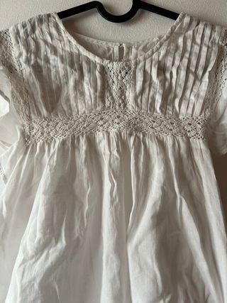 Blusa de tela ligera con detalles de encaje y volantes. - Diseño con fruncidos en el pecho. - Mangas cortas con volantes. - Adorno de encaje en la zona del busto y cintura. - 100% algodón.
