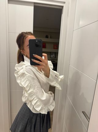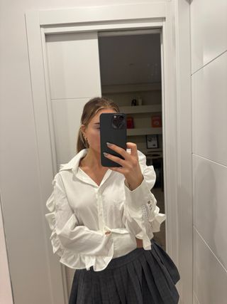 Camisa blanca con un diseño moderno y elegante. - Mangas con volantes. - Detalle de encaje en los puños. - Cuello camisero.