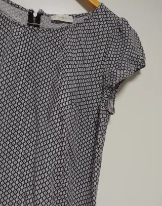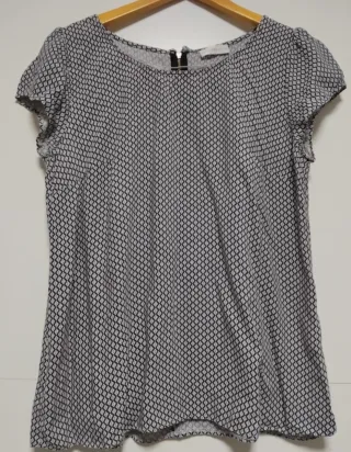 Blusa con un estampado geométrico en blanco y negro. Tiene un cierre de cremallera en la parte delantera. - Diseño de manga corta. - Cuello redondo.