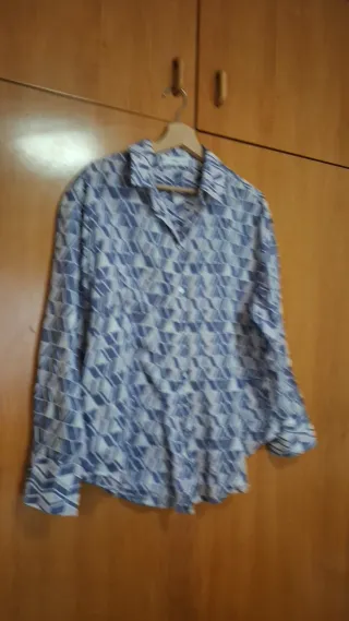Blusa con un diseño geométrico en tonos azules y blancos. Es una prenda de manga larga con cuello camisero y cierre de botones. - Estampado geométrico. - Cuello camisero. - Manga larga.
