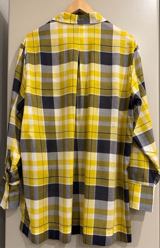 Blusa de cuadros con un diseño llamativo mas largo de atrás. Tejido de algodón fino y fresco. - Cuadros en tonos amarillos, blancos y azul marino. - Manga larga. - Cierre de botones.