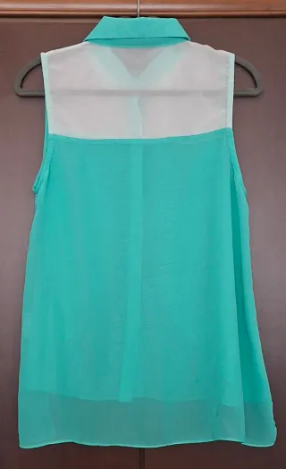 Blusa sin mangas con un diseño de pliegues verticales en el frente. La parte central presenta una combinación de verde esmeralda y verde menta, rodeada por un tejido blanco translúcido. - Diseño con pliegues. - Tejido ligero.