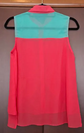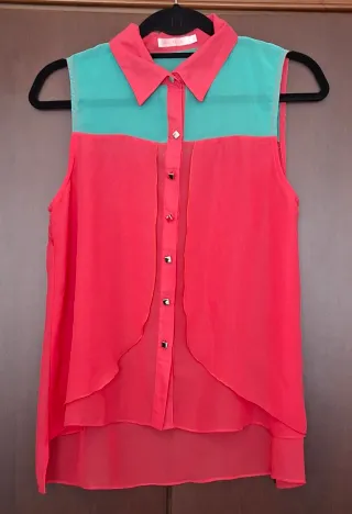 Blusa de color rosa y verde con cuello camisero. Lleva 7 originales botones con forma cuadrada y brillante. La parte superior es en blanco. Hombros: 33 cm. Cuello en rosa. A partir de la parte superior del pecho en color verde. A ambos lados en la parte frontal monta una capa del mismo tejido en forma ovalada. Pecho: 47 cm. Es mas corta en la parte delantera Largo frontal: 61 cm aprox. Largo trasero: 73 cm aprox. Una blusa muy original. Tejida en polyester muy fino y muy fresca para el verano. Nueva sin etiquetas.