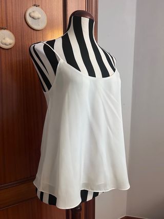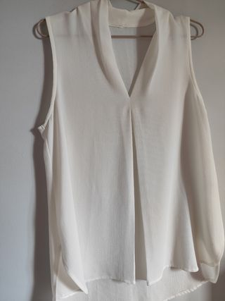 Blusa de tirantes estrechos, vaporosa, fluida y con vuelo de Stradivarius en talla S en blaco roto. Muy poco uso. Es elegante pero informar y parece como se seda aunque es poliéster por su caída. Detalle de cierre de botones en la espalda. No regateo.
