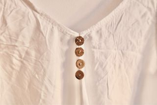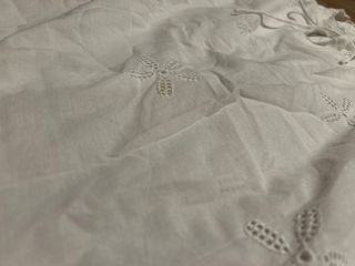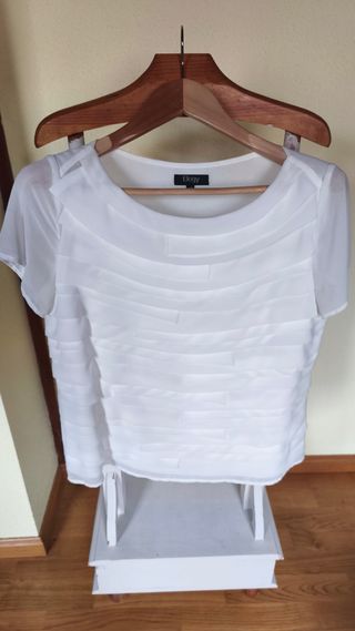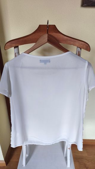 Blusa de algodón en color blanco con un diseño moderno. - Mangas cortas. - Escote en pico. - Ojales metálicos en los laterales. - Lazos ajustables en los laterales. Puede servir para talla S.