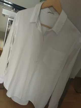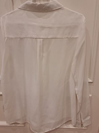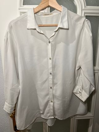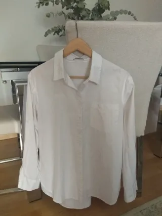 Blusa de popelín en color blanco. Un básico versátil para cualquier ocasión. Perfecto estado. Nueva - Cuello camisero. - Cierre de botones. - Manga larga.