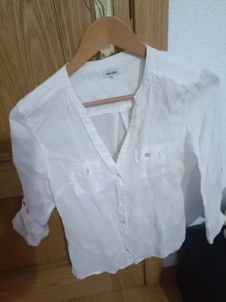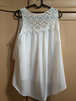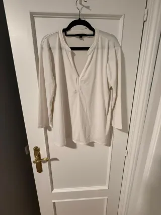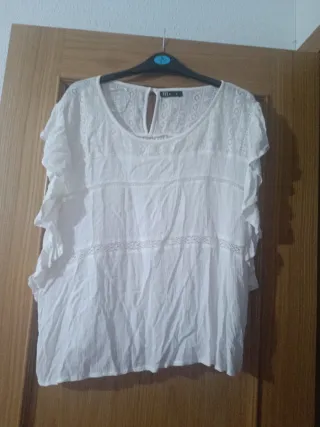 Blusa blanca de manga corta. Talla aproximada 48. Medidas: de hombro a hombro 40 centímetros; de sisa a sisa 57 centímetros; largo 62 centímetros. Usada, buen estado.