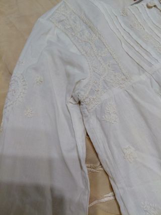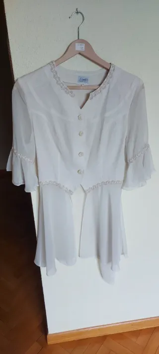 2xElegante blusa blanca de manga larga. T 48. MEDIDAS: 1 foto:ancho hombros 42cm/sisa 53/ largo 66/ manga 62. 4 foto: ancho hombros 44cm/ largo 70/ sisa 55/ manga 63 - Cuello con volantes. - Cierre de botones. - Pequeño bordado floral en el pecho. - Puños con volantes. Precio Lote de 2 por 10€.