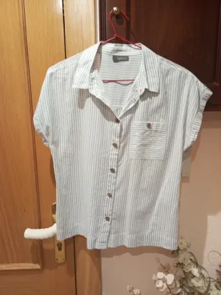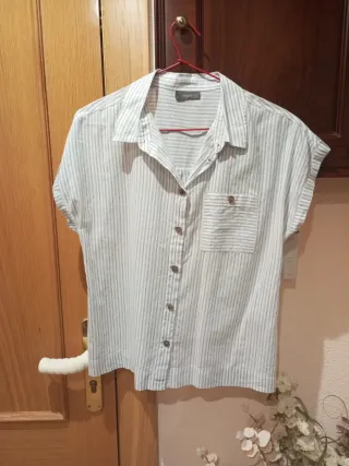 Blusa de manga corta con un diseño de rayas verticales. Medidas hombros caídos 59 cm largo 60 cm axila 53 cm Tejido muy ligero y fresquito - Cuello camisero. - Cierre de botones. - Bolsillo en el pecho.