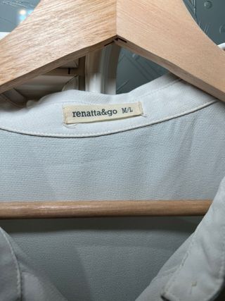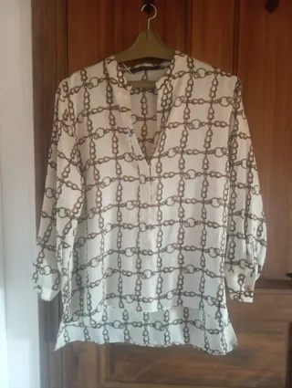 Elegante blusa de Zara con un estampado de cadenas en tonos dorados y blancos. Su diseño fluido la hace perfecta para cualquier ocasión. - Cuello mao. - Manga larga con puño abotonado. - Bajo asimétrico. Medidas 42 hombros 66 largo delantero 74 largo trasero