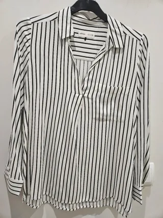 Blusa de manga larga con un diseño de rayas verticales en blanco y negro. Presenta un cuello camisero y un bolsillo en el pecho. - Diseño de rayas verticales. - Cuello camisero. - Bolsillo en el pecho.