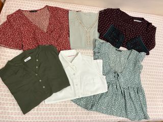 Conjunto de seis blusas en tallas S/M. Incluye prendas en tonos verdes y rojos. - Blusa granate estampada (una de las gomas de la manga esta dada de si) Sfera Talla M - Blusa verde militar C&A Talla M - Camisa blanca sin mangas Misses & Girls Talla 42 - Blusa verde estampada Shein talla XS - Blusa roja manga mariposa estampada Shein lalla XS - Blusa verde agua con bordado dorado Talla M (nueva)