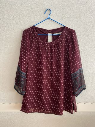 Blusa Bershka con un llamativo estampado. - Diseño con escote Bardot. - Mangas largas abullonadas con elástico. - Bajo con volante. Si quieres conocer las medidas exactas, escríbeme y con gusto te las facilito. No acepto devoluciones por talla, ya que las medidas pueden variar según la marca.