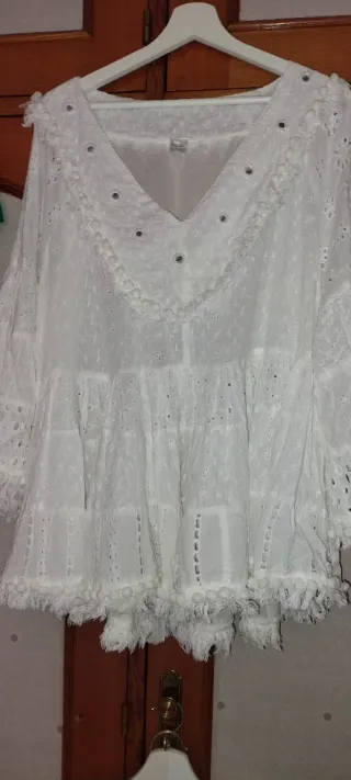 Preciosa blusa blanca con detalles bordados y volantes tipo ibicenco - Escote en V. - Mangas largas acampanadas. - Adornos de encaje y ojales. - Bajo con volantes y flecos.