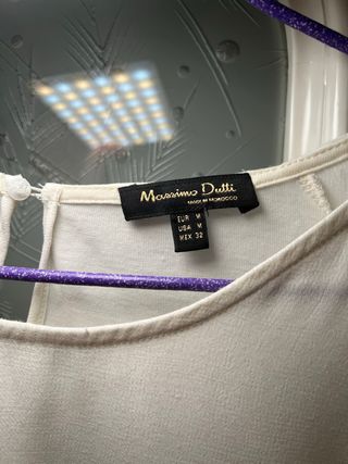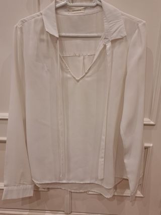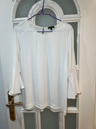 Elegante blusa de Massimo Dutti en color blanco y talla M. Perfecta para cualquier ocasión. - Diseño con mangas acampanadas. - Cuello redondo con abertura trasera. - Tejido ligero y fluido.