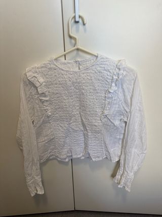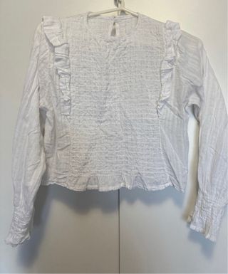 Blusa blanca con un diseño texturizado y detalles de volantes. - Mangas largas con puños elásticos. - Cuello redondo. - Tejido ligero y con textura.