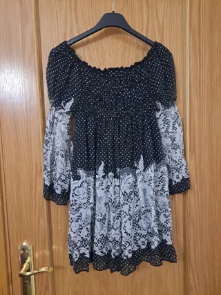Elegante blusa con un diseño de lunares y detalles de encaje. - Estampado de lunares blancos sobre fondo negro. - Adorno de encaje floral en el bajo y mangas. - Diseño con escote elástico. - Mangas acampanadas. De ropa solo hago envios!!