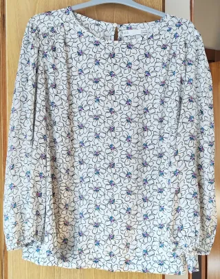 Blusa de Zara con un bonito decorado en tonos blancos y azules con destellos dorados. Presenta un escote en pico y mangas largas abullonadas. - Diseño con estampado. - Escote en pico. - Mangas largas abullonadas. - Bajo elástico. - Detalles dorados.