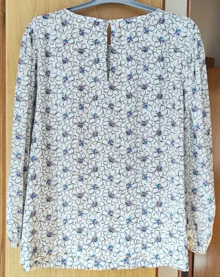 Blusa con estampado floral y manga larga ajustable - Diseño con flores blancas y detalles en azul y morado. - Cuello redondo con abertura en la espalda. - Puños elásticos.