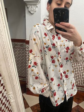 Blusa de manga larga con un bonito estampado floral. - Diseño con flores rojas y detalles amarillos. - Cuello camisero. - Cierre de botones.