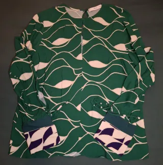 Blusa de manga larga con estampado de ondas en verde y blanco y detalles de lazada en los puños. - Diseño con cuello redondo y cierre de botón en la nuca.