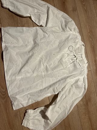 Preciosa blusa de manga larga para niña con delicados bordados. - Diseño con cuello redondo y cierre de botón. - Detalle de puntillas y bordados florales. - Tejido ligero y transpirable.