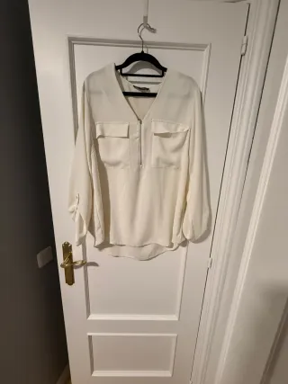 Blusa elegante de color blanco, ideal para cualquier ocasión. - Diseño con cuello en V y detalle de cremallera. - Dos bolsillos frontales con solapa. - Mangas largas con puños. - Tejido ligero y fluido.