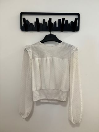 Elegante blusa blanca con un diseño delicado y femenino. - Mangas largas abullonadas. - Detalle de volantes en los hombros. - Tejido con pequeños topos. - Puños y cintura elásticos.
