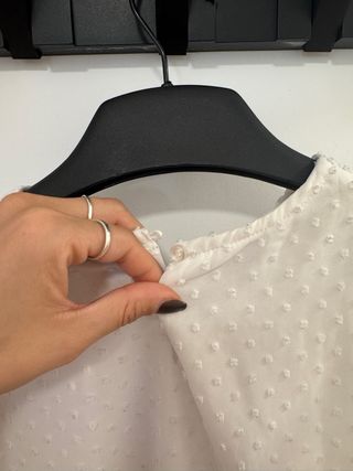 Elegante blusa con estampado de lunares en blanco. Destaca por su detalle de nido de abeja (elástico) tanto en la zona del canesú (pecho y espalda) como en los puños, lo que le aporta una caída fluida y un ajuste cómodo. Detalles Marca: Sfera (Línea Casual). Tejido: 100% Poliéster (tejido tipo gasa, ligeramente semitransparente). Diseño: Cuello redondo con cierre de botón en la parte posterior (ojo de cerradura) y manga larga con acabado elástico Talla en etiqueta: L (EUR L / MEX 32). Axila a axila: 55 cm. Hombro a hombro: 43 cm. Largo total: 61 cm.