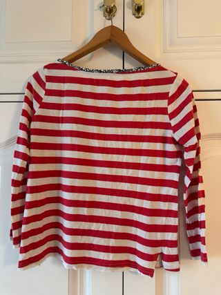 Blusa de manga larga con un diseño de rayas rojas y blancas. El cuello tiene un detalle de estampado floral. - Cuello con detalle de estampado. - Logo en el pecho.