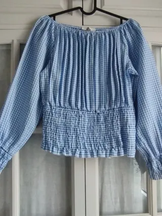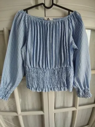 Blusa con estampado de cuadros Vichy en tonos azul claro y blanco. Presenta un diseño fruncido en la cintura y mangas largas abullonadas. Ideal primavera- verano - Escote Bardot. - Cintura elástica. - Puños ajustados.