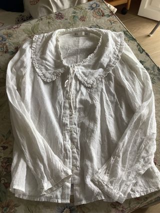 Elegante blusa blanca de Zara con un delicado cuello Peter Pan. - Cuello con detalle de encaje negro. - Mangas largas abullonadas con puño fruncido. - Tejido ligero y vaporoso.