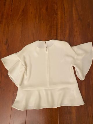 Elegante blusa de Carolina Herrera. - Diseño con mangas acampanadas. - Detalle de volante en el bajo. - Cuello caja - Botón de perla