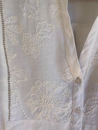 Blusa de mujer con un diseño delicado y detalles bordados. - Escote en V con adornos. - Mangas tres cuartos. - Bajo con bordado. - Tejido ligero y con textura. Tiene unos agujeritos en la parte sombreada de la que he subido foto, muy poco usada