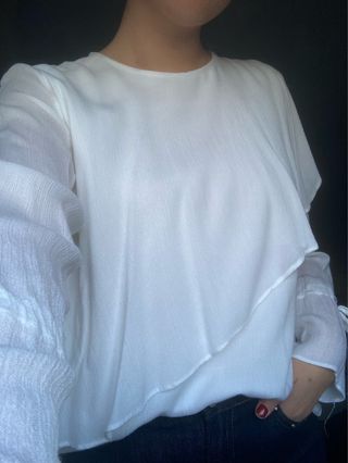 Elegante blusa blanca. - Tejido ligero y vaporoso. - Mangas acampanadas con detalle de lazada. - Capa superpuesta asimétrica en el delantero.