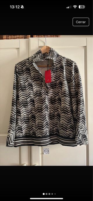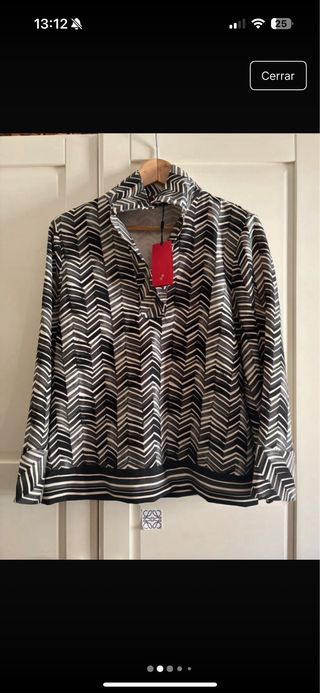 Prenda especial y ultraelegante. Se nota la gama alta de la marca. Manga sentada y larga. El bajo se pude recoger con un bonito detalle de presilla y botón. El corte es recto y holgado, pero no queda excesivamente amplia. El tejido es muy agradable al tacto. Generoso escote en V. Yo lo cerré un poco a mano. Para hacer la foto de como era original, deshice los puntos que yo había cosido. Ahora se notan un poco. Esto lo dejo a elección de la persona (volverlo a cerrar cosiendo a mano, o dejarlo tal cual era inicialmente) Ancho espalda: 40 cm. Pecho: 100cm. Bajo: 130 cm. Largo: 65 cm. Largo manga: 65 cm. Escote original: 31 cm.