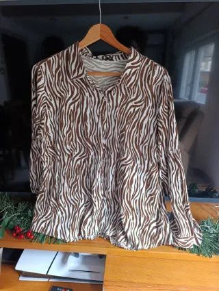 Blusa con un llamativo estampado de cebra en tonos marrones y blancos. Su diseño la hace perfecta para añadir un toque salvaje a tu armario. - Manga larga. - Cuello camisero. - Cierre de botones.