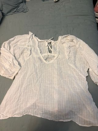 Blusa blanca de manga corta. Talla aproximada 48. Medidas: de hombro a hombro 40 centímetros; de sisa a sisa 57 centímetros; largo 62 centímetros. Usada, buen estado.