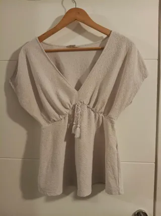 Blusa de manga corta con escote en V y detalle de cordón. - Tejido ligero con pequeños detalles. - Cintura elástica fruncida con cordón y borlas. - Corte holgado.