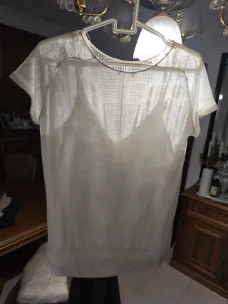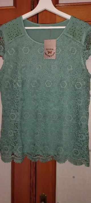 Camiseta de manga corta con un bonito diseño de encaje por delante, por detrás lisa. Nueva - Detalle de pedrería en los hombros. - Tejido ligero y transpirable.