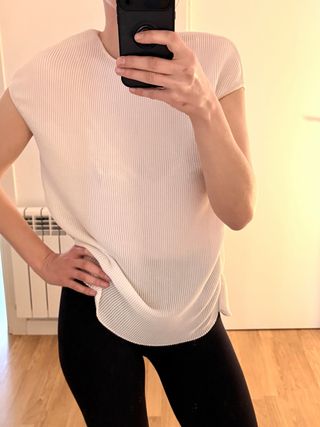 Blusa de COS con un diseño texturizado y fruncido. - Tejido con relieve vertical. - Corte holgado. - Manga corta. - Cuello redondo. Preciosa blusa blanca del tejido de textura fruncido. El cuello, las mangas tienen una goma de color crema. Nunca ha sido usada. Talla M