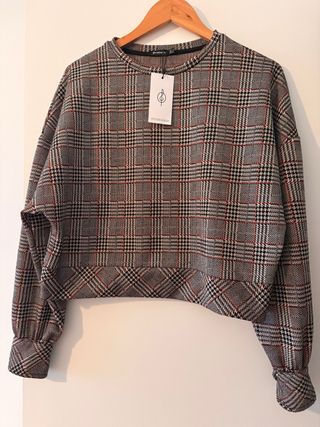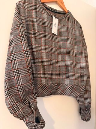 Blusa de Stradivarius con un diseño de cuadros llamativo. - Manga larga abullonada. - Puños con botón. - Corte cropped.