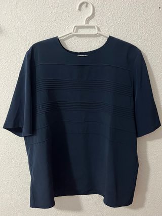 Elegante blusa de vestir en color azul marino. Presenta un diseño con detalles plisados horizontales en la parte superior delantera. - Diseño con plisados. - Manga corta. - Corte recto.