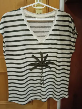 Blusa de manga corta con un diseño de rayas horizontales y un detalle de palmera bordada en la parte delantera. El escote es en pico y el tejido es ligero, ideal para el verano. - Diseño de rayas blancas y verdes. - Bordado de palmera. - Escote en pico.